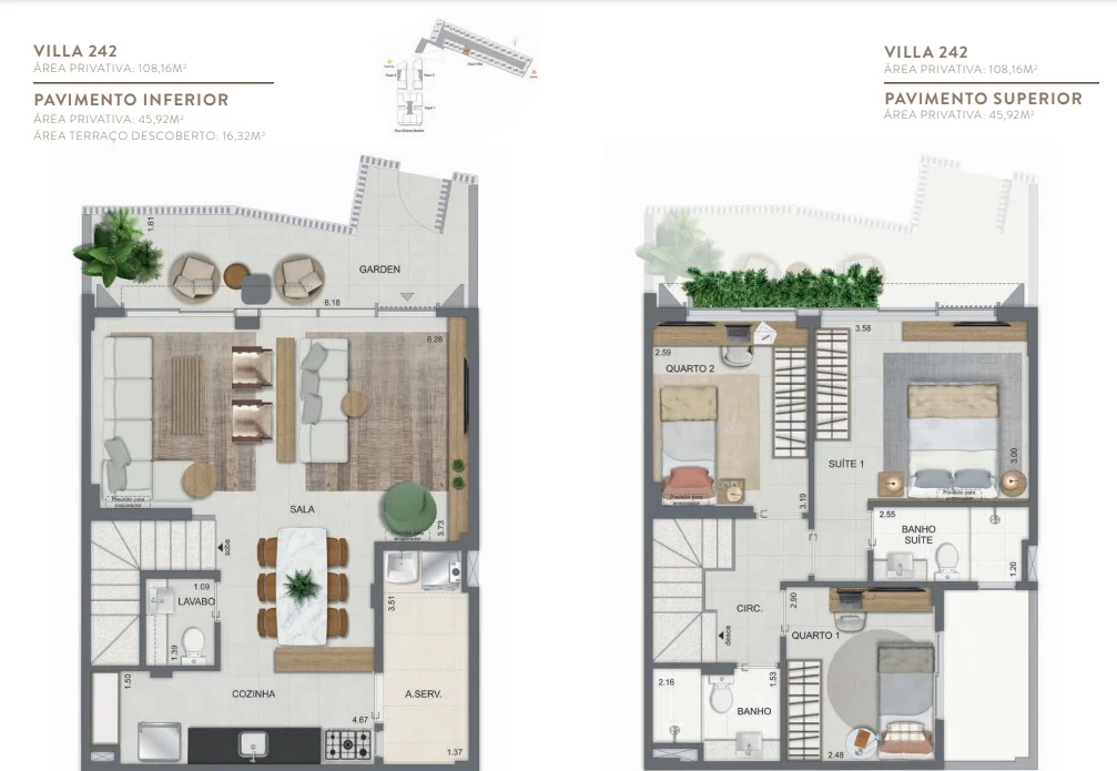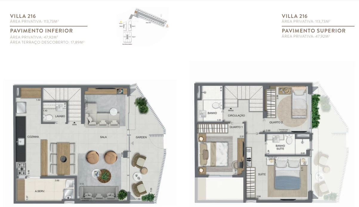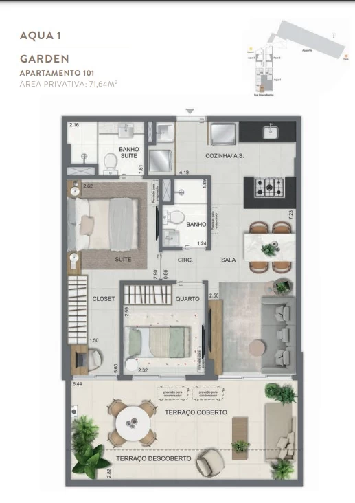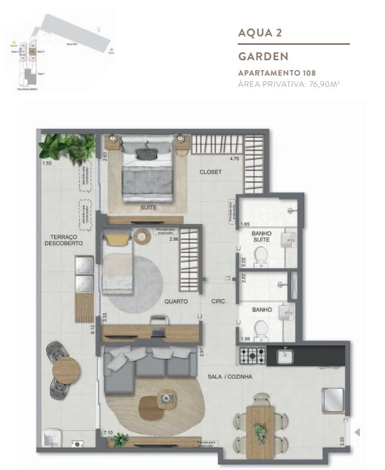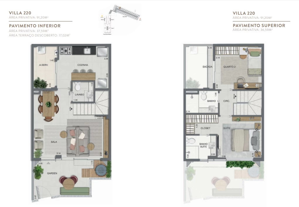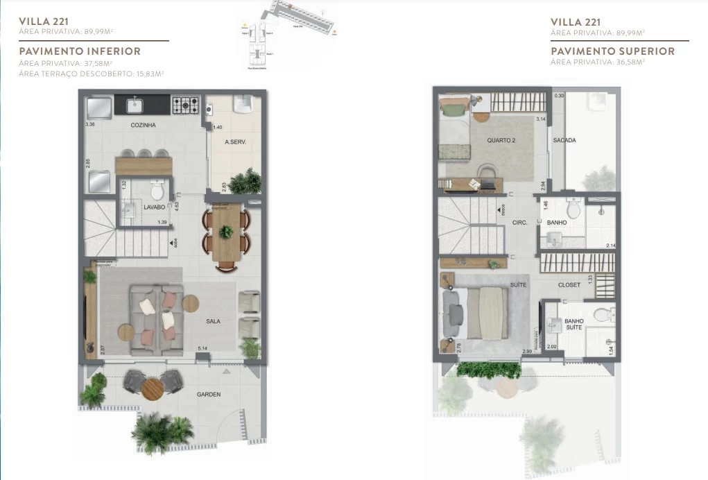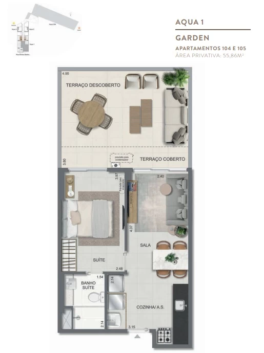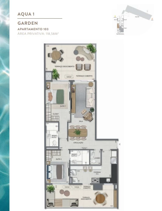 Gardens de 1 Quarto com 55m² / Gardens de 2 Quartos 68m² a 118m² / Garden de 3 quartos com 110m² / Unidades de 2 Quartos de 56m² a 70m² / Unidades de 3 Quartos de 96m² a 105m² / Coberturas de 3 Quartos com 114m² a 141m² / Coberturas de 4 Quartos com 194m² a 211m². Aqua Villa Casas - Casas de 2 Quartos com 88m² a 91m² / Casas de 3 Quartos com 101m² a 123m².