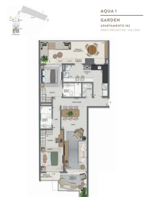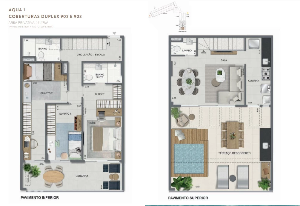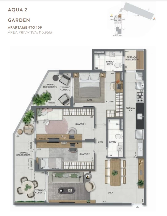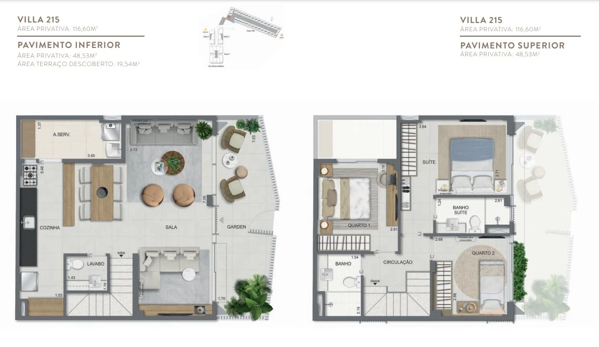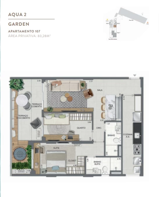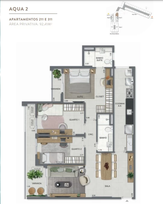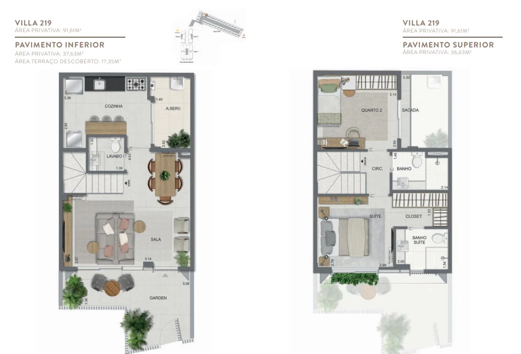 Gardens de 1 Quarto com 55m² / Gardens de 2 Quartos 68m² a 118m² / Garden de 3 quartos com 110m² / Unidades de 2 Quartos de 56m² a 70m² / Unidades de 3 Quartos de 96m² a 105m² / Coberturas de 3 Quartos com 114m² a 141m² / Coberturas de 4 Quartos com 194m² a 211m². Aqua Villa Casas - Casas de 2 Quartos com 88m² a 91m² / Casas de 3 Quartos com 101m² a 123m².