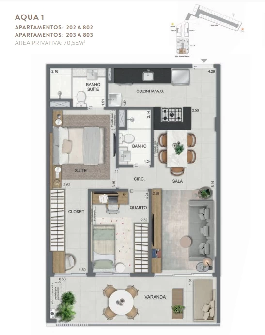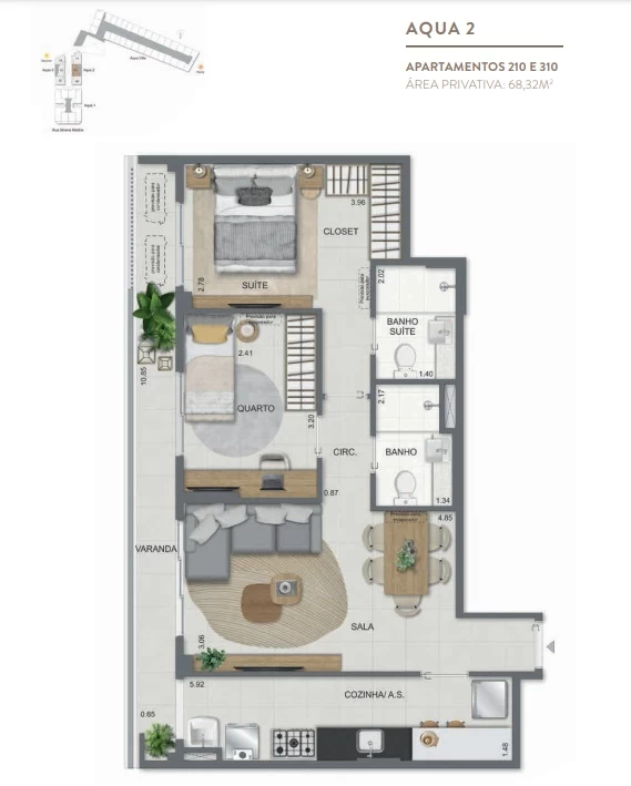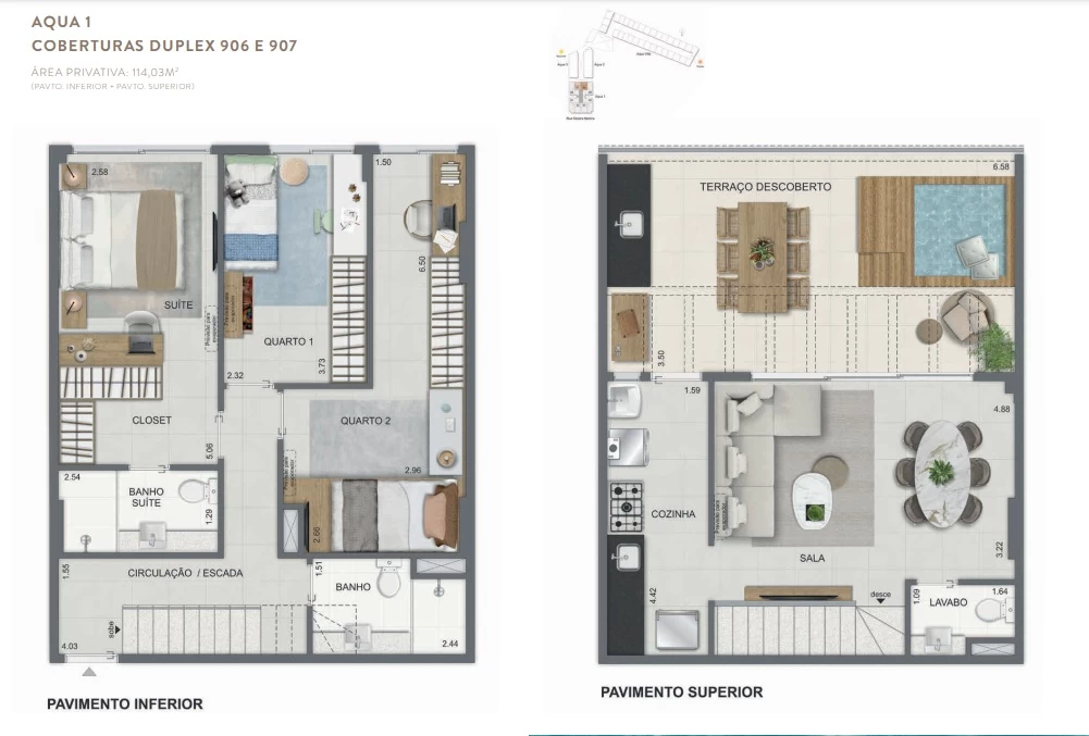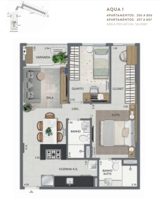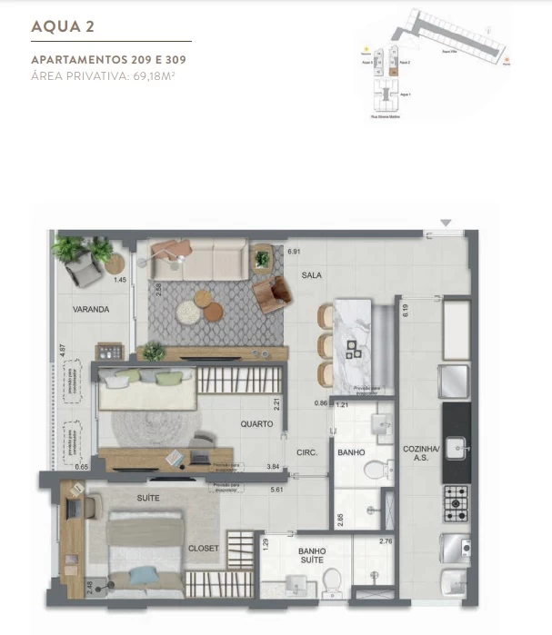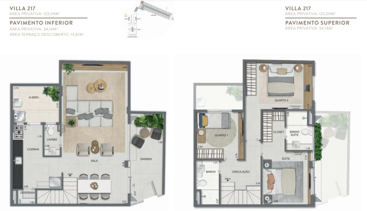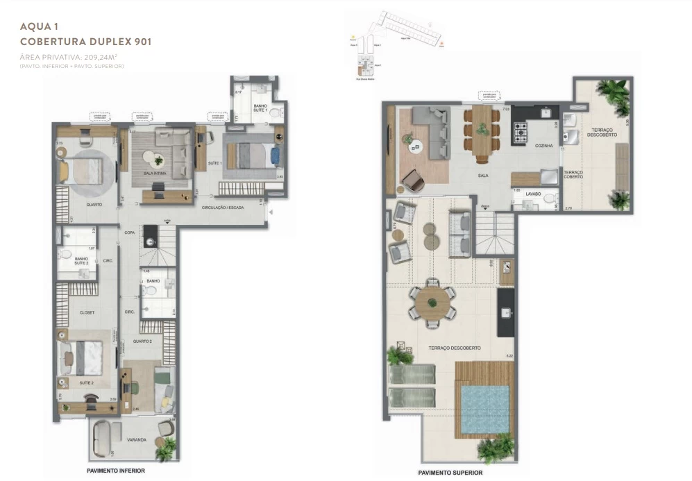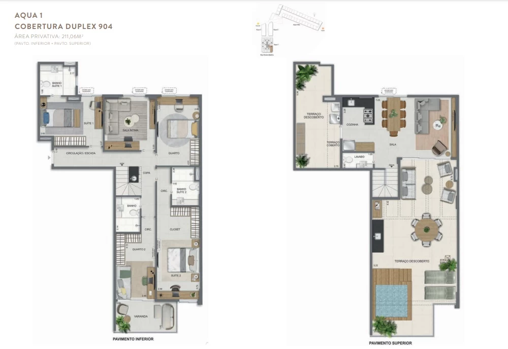Gardens de 1 Quarto com 55m² / Gardens de 2 Quartos 68m² a 118m² / Garden de 3 quartos com 110m² / Unidades de 2 Quartos de 56m² a 70m² / Unidades de 3 Quartos de 96m² a 105m² / Coberturas de 3 Quartos com 114m² a 141m² / Coberturas de 4 Quartos com 194m² a 211m². Aqua Villa Casas - Casas de 2 Quartos com 88m² a 91m² / Casas de 3 Quartos com 101m² a 123m².