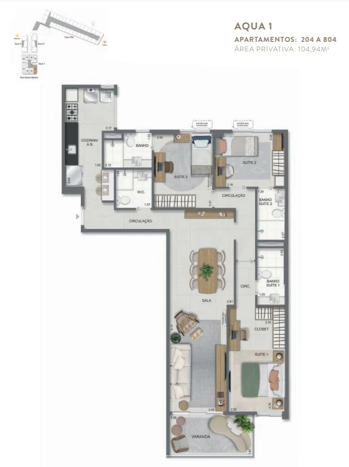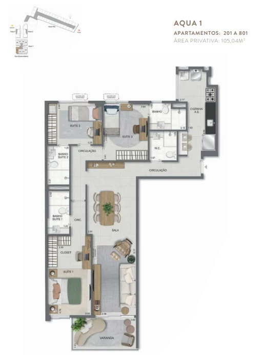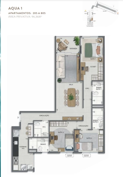 Unidades de 3 Quartos de 96m² a 105m².
